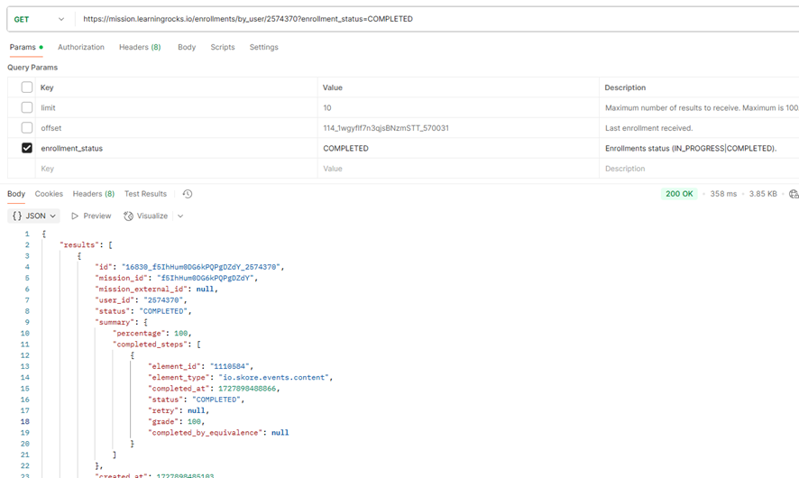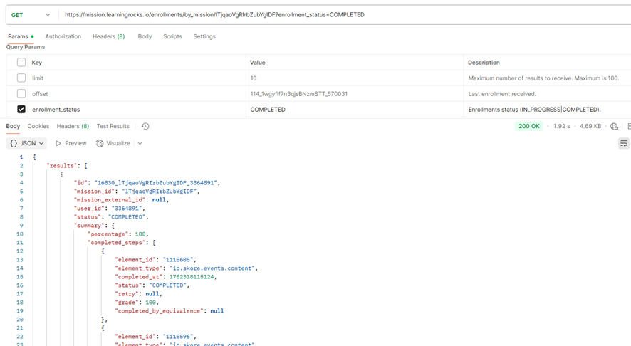 - Enrollment_status: é um parâmetro obrigatório na busca, e pode ser “COMPLETED” ou “IN_PROGRESS”. Se enviado “COMPLETED”, serão listados os usuários que já concluíram a missão. Se enviado “IN_PROGRESS”, serão listados usuários que ainda estão realizando a missão.