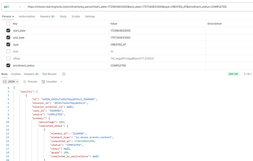 Para isso, é necessário enviar o comando GET para a URL: https://mission.learningrocks.io/enrollments/by_period?start_date=542948400000&end_date=3698708400000&type=CREATED_AT&enrollment_status=COMPLETED. Os campos grifados se referem aos parâmetros obrigatórios da busca, conforme explicado abaixo.