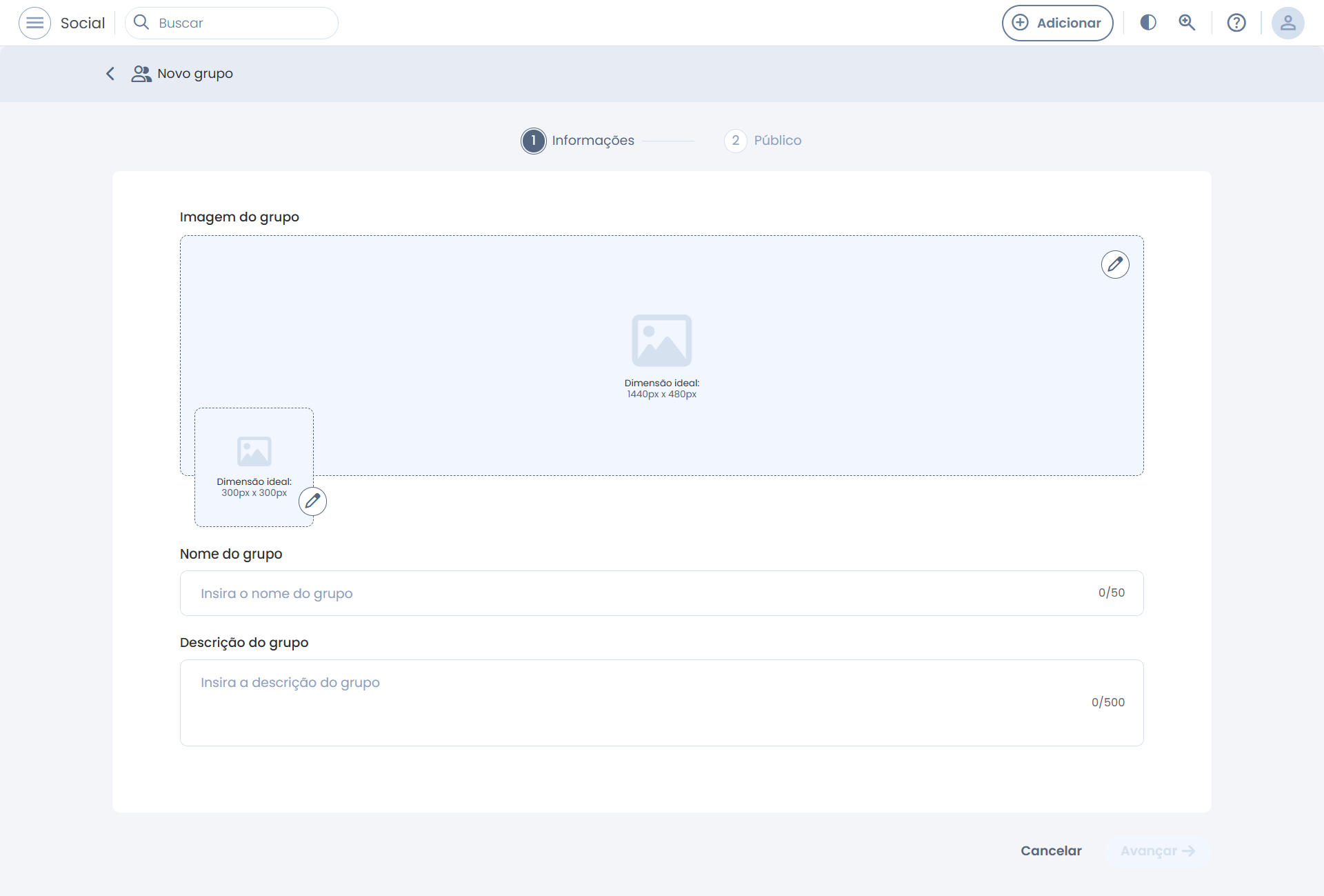 - Você poderá selecionar a imagem de capa e de logo do grupo, respeitando as dimensões indicadas;