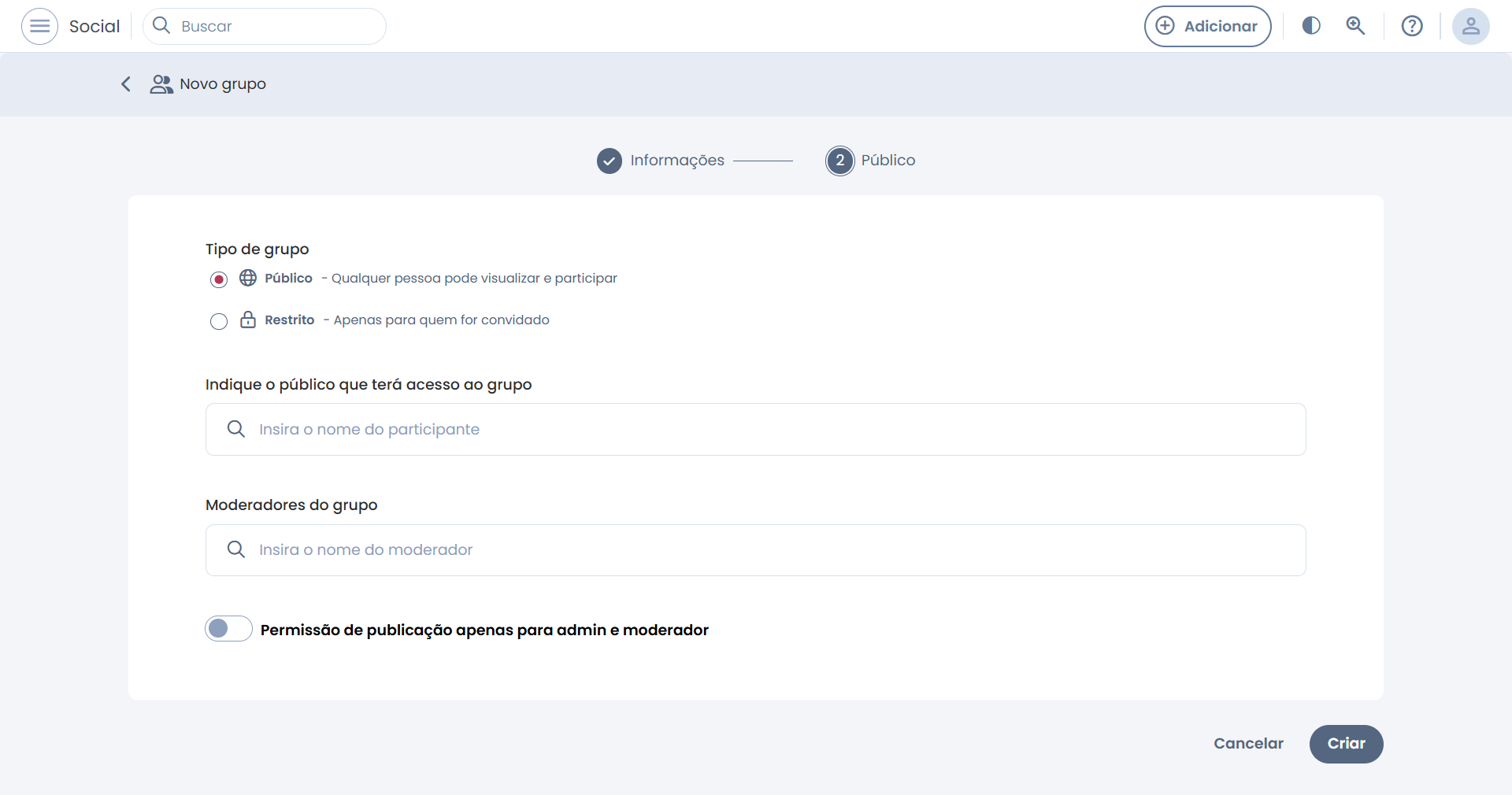 Usuários com perfil de administrador no ambiente podem realizar a criação de grupos no Social, para isso, siga o passo a passo abaixo: