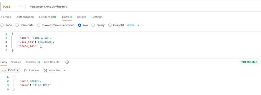 Para criar um time, basta enviar o comando POST para a URL: https://user.skore.ai/v1/teams