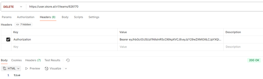 Para deletar um time, basta enviar o comando DELETE para a URL: https://user.skore.ai/v1/teams/id, sendo que o campo “id” deve ser trocar pelo id do time que será excluído.