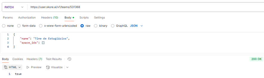 Para atualizar um time, basta enviar o comando PATCH para a URL: https://user.skore.ai/v1/teams/id, sendo que o campo “id” deve ser trocado pelo id do time que será atualizado.
