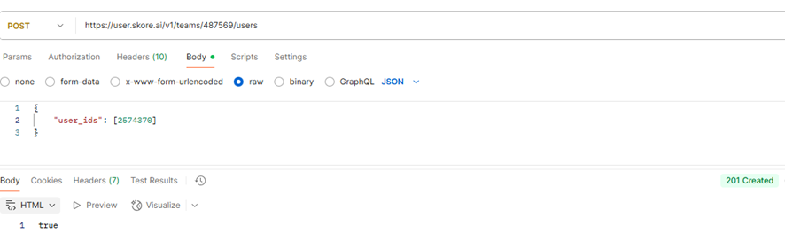 Para adicionar usuários a um time, é necessário enviar um POST para a URL: https://user.skore.ai/v1/teams/id/users, sendo que o campo “id” deve ser trocado pelo id do time que receberá novos usuários.
