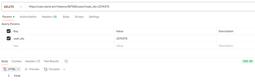 Para remover apenas um usuário de um time, é necessário seguir a estruturauser_ids=:userId, substituindo userId pelo ID do usuário a ser removido.. Exemplo da URL para remover apenas um usuário: https://user.skore.ai/v1/teams/id/users?user_ids=userId.