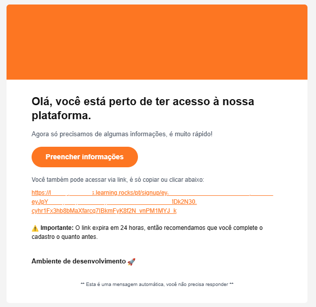 O link do convite pode ser acessado apenas uma vez e tem validade de 24 horas. Caso acesse e não complete o cadastro ou perca o prazo de validade, será necessário iniciar o processo de solicitação do link a partir do passo 1.