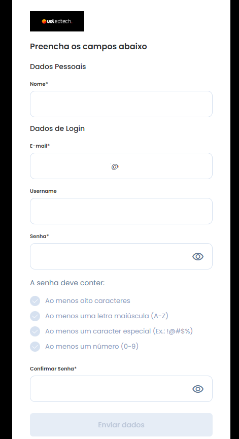 - Conter ao menos um caractere especial (Ex: !@#$?%);