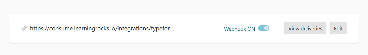 - Na janela que será exibida, insira a URL a seguir: https://consume.learningrocks.io/integrations/typeform/completed?key=000, substituindo o final 000 pelo ID do seu ambiente no Learning.rocks. Exemplo: se o ID for 1234, então o final do URL deve ser alterado para key=1234. Caso você não saiba o ID da sua empresa, é só falar com o CS da sua conta.