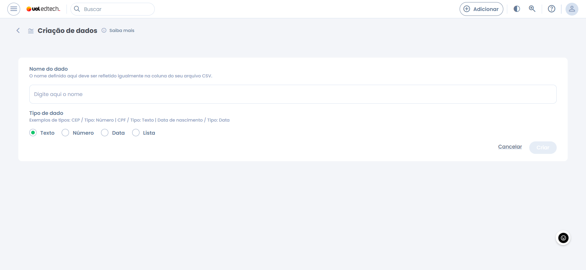 - Tipo de dado: Você deverá selecionar entre: