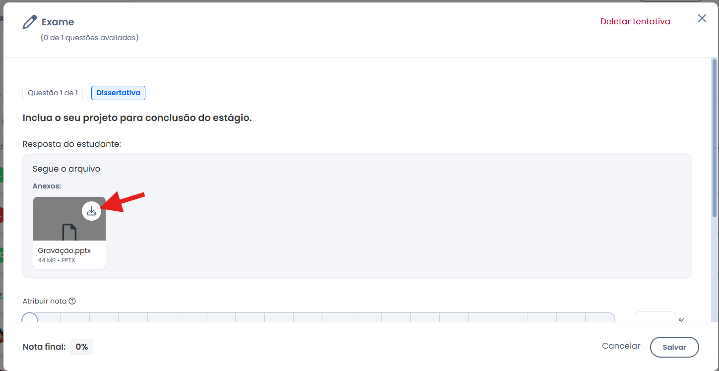 Se a questão dissertativa possibilitar a inclusão de um arquivo (opcional ou obrigatório), você poderá realizar o download para correção da questão.