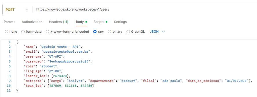 - Team_ids: Define os times dos quais o usuário fará parte. É necessário identificar cada time pelo seu ID, que pode ser obtido por meio de um “Get All Teams” (disponível na collection “Teams”) ou nos relatórios da plataforma. Exemplo: “team_ids”: [12546, 58795]