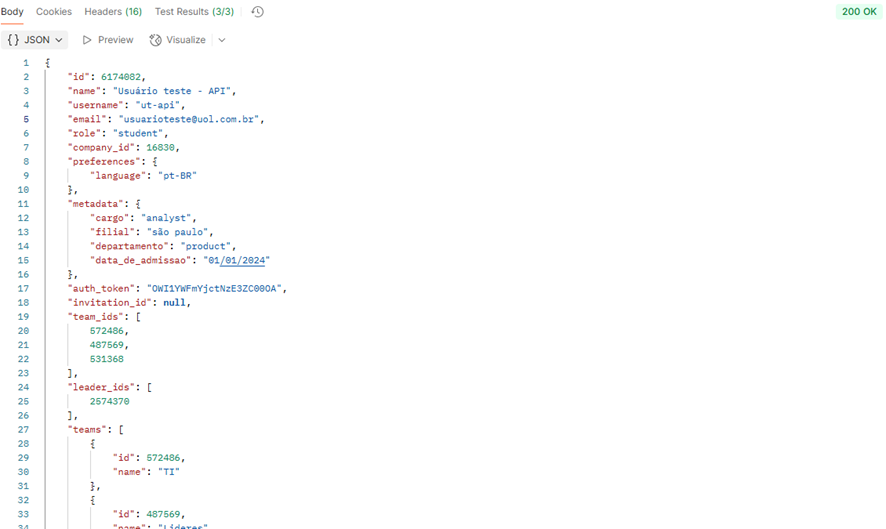 Se a criação ocorrer corretamente, você receberá o retorno “200 OK”, e uma response com detalhes da criação e informações do usuário, conforme exemplo abaixo: