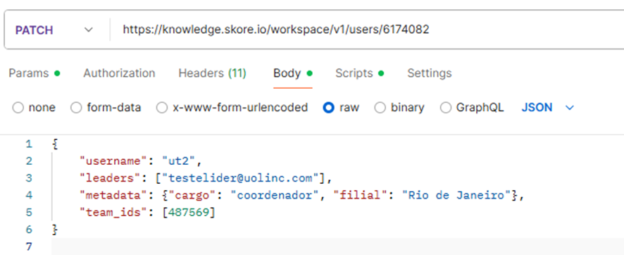 "leaders": [] (em branco), todos os líderes atuais serão removidos e o usuário ficará sem líderes na plataforma.- metadata: define os metadados do usuário.