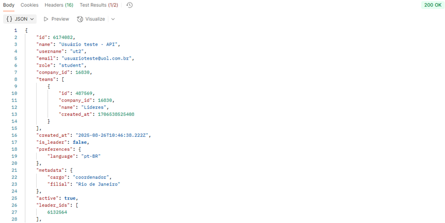Se a atualização ocorrer corretamente, você receberá o retorno “200 OK”, e uma response com detalhes da atualização e informações do usuário, conforme exemplo abaixo: