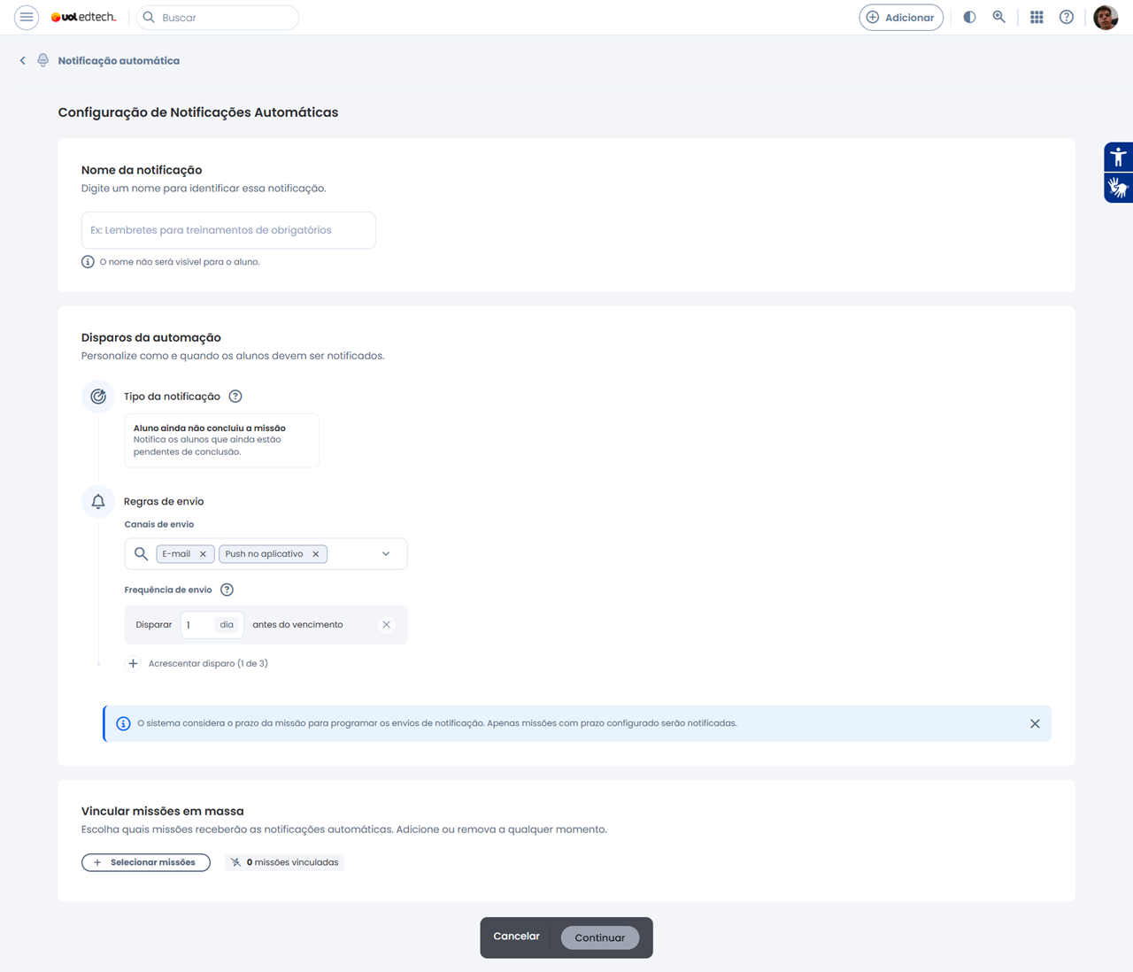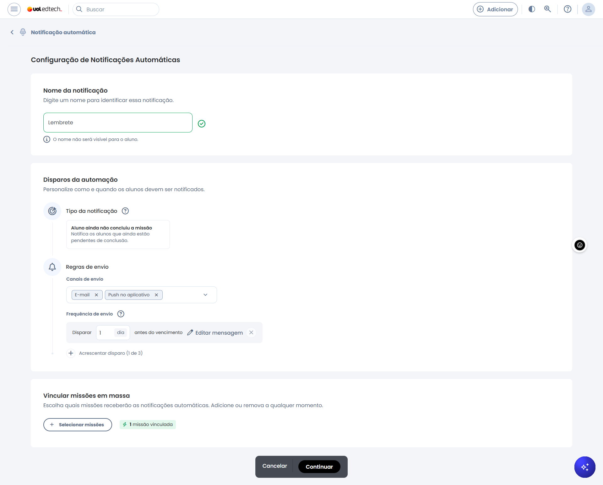 - A notificação não funciona de forma retroativa, portanto serão realizados disparos para usuários que estiverem com a missão pendente após a configuração.